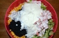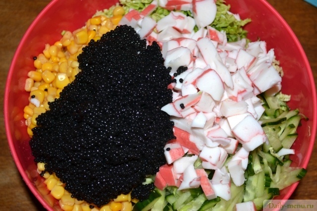 капуста пекинская, кукуруза консервы, крабовые палочки, огурец грунтовый, икра из морских водорослей, йогурт 1,5% , соевый соус, перец черный молотый