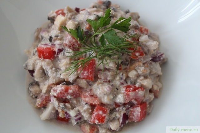 шампиньоны, помидоры, куриная грудка, без кожи, лук репчатый, сыр полутвердый (голландский), масло оливковое, петрушка