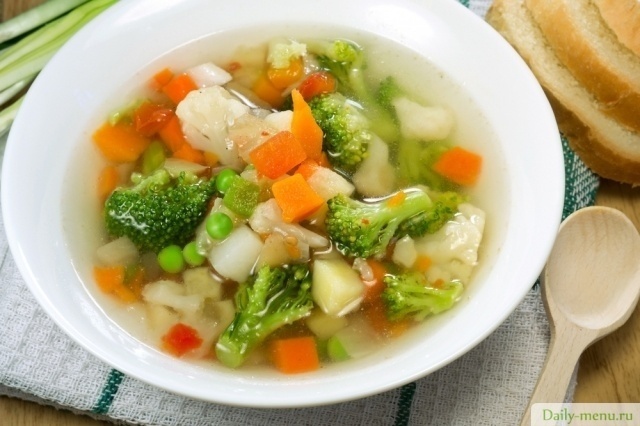 бульон овощной основной, брокколи, горошек замороженный, помидоры, морковь, лук репчатый, перец красный сладкий