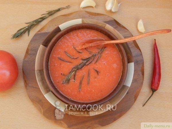 помидоры, сок томатный (свежевыжатый), лук репчатый, масло подсолнечное, петрушка, чеснок, перец черный молотый, соль поваренная пищевая