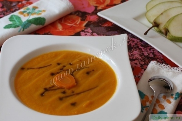 вода, морковь, груша свежая, лук репчатый, чеснок, масло подсолнечное, приправа для супа (овощная), перец черный молотый, соль поваренная пищевая