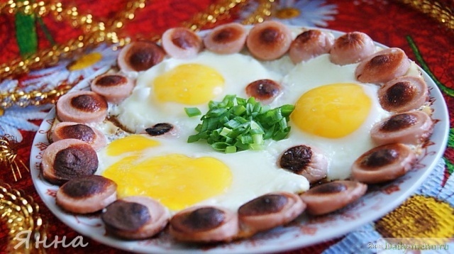 яйцо куриное, сосиски молочные , соль поваренная пищевая, масло подсолнечное
