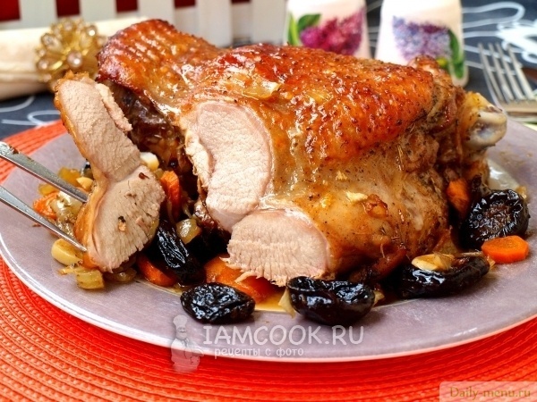 индейка (бедро) , вино белое, чернослив вяленый , лук репчатый, морковь, лимон, чеснок, масло подсолнечное, розмарин сухой, перец красный молотый , перец черный молотый, базилик сушеный, соль поваренная пищевая