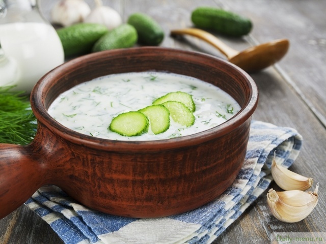 йогурт натуральный 2%, вода, огурец грунтовый, укроп и другие пряные травы, масло оливковое, чеснок, соль поваренная пищевая
