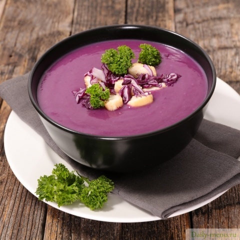 овощной бульон, свекла, картофель, сливки 9% жирности, лук репчатый, морковь, масло оливковое, соль поваренная пищевая, чеснок, перец черный молотый