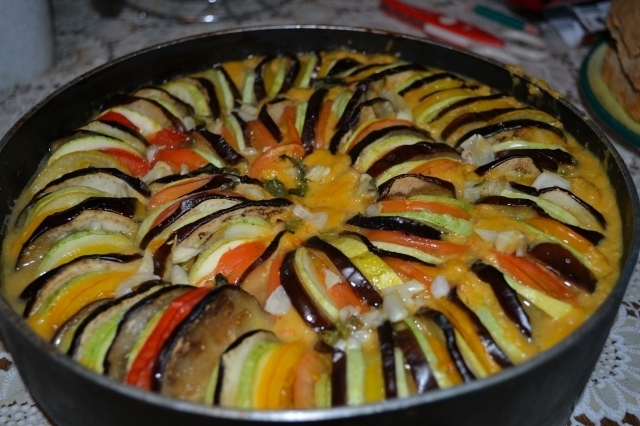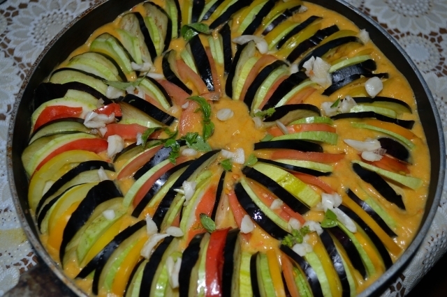 помидоры, кабачок, баклажаны, перец красный сладкий, лук репчатый, масло оливковое, чеснок
