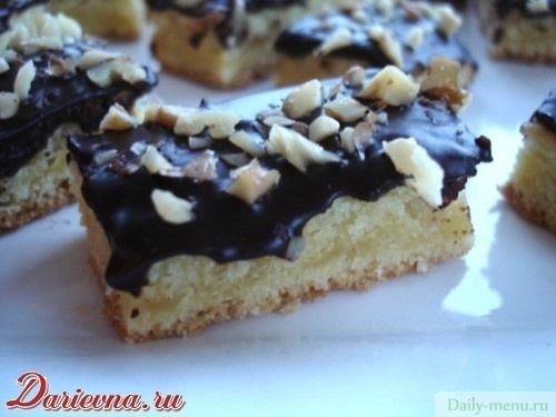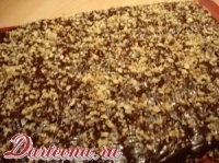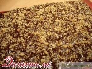 5. Приготовить глазурь: смешать сахарную пудру с какао, развести теплым молоком до густоты сметаны, добавить размягченное масло и тщательно растереть. На остывший корж нанести глазурь и сразу, пока глазурь не застыла, посыпать орехами.