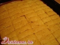 4. Горячий корж разрезать на небольшие палочки. Оставить охлаждаться.