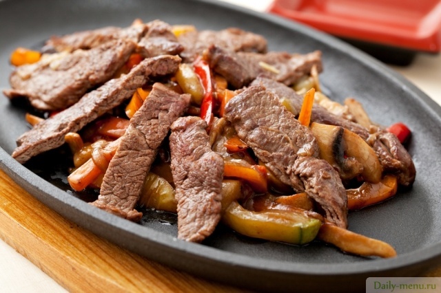 говядина вырезка, соевый соус, перец сладкий, перец болгарский красный, лук зеленый, вино сухое, масло оливковое, зира (кумин), имбирь порошок, перец чили, перец черный молотый, чеснок