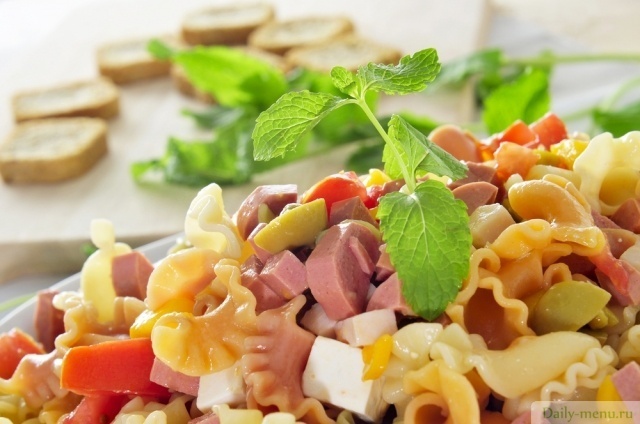 макароны из муки в/с, колбаса вареная молочная, перец болгарский красный, огурец маринованный, лук репчатый, петрушка, майонез