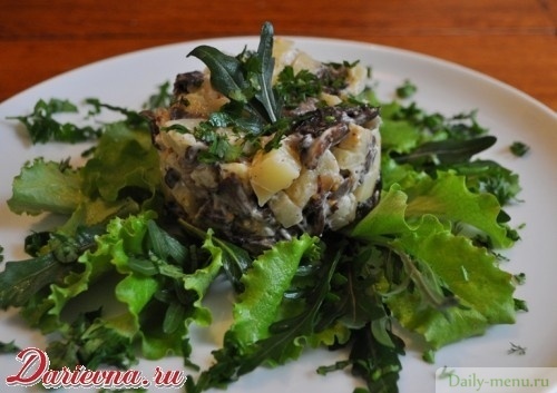 картофель, лук репчатый, шампиньоны, рукола, салат, укроп и другие пряные травы, горчица-семя, масло подсолнечное, соль поваренная пищевая, перец черный молотый