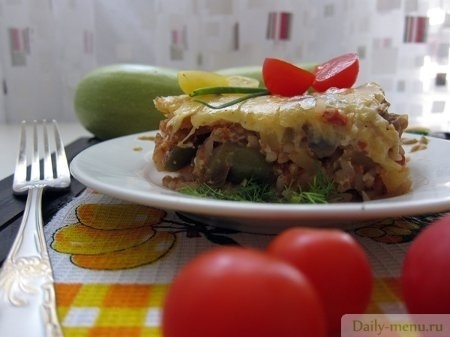 вода, сыр полутвердый (голландский), рис белый, яйцо куриное, сливки, 20,0% жирности, томатная паста, сахар-песок, горчица столовая, перец болгарский красный, помидоры, баклажаны, кабачок, лук репчатый, чеснок, перец черный молотый, соль поваренная пищевая