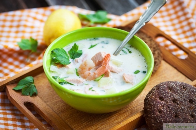 вода, лосось атлантический (семга), картофель, сливки, 20,0% жирности, морковь, лук репчатый, мука пшеничная , соль поваренная пищевая, перец черный молотый