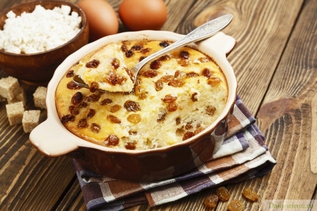 творог 11%, изюм кишмиш, крупа манная, сметана 18% жирности, яйцо куриное, масло сливочное 72%, сахар-песок, соль поваренная пищевая, ванильный сахар