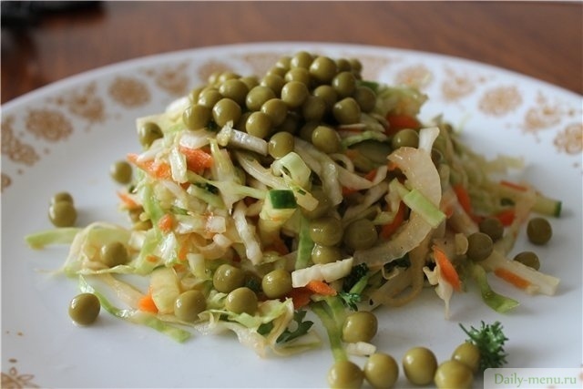 капуста белокочанная, морковь, горошек зеленый. консервы, сок лимонный, масло оливковое