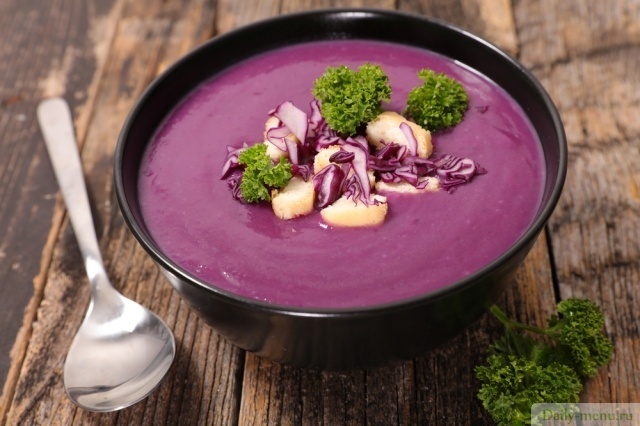 куриный бульон, капуста краснокочанная, картофель, лук репчатый, масло топленое, чеснок, соль поваренная пищевая, перец черный молотый