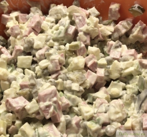 колбаса вареная докторская, яйцо куриное, горошек зеленый. консервы, огурец соленый, авокадо, майонез , лук репчатый
