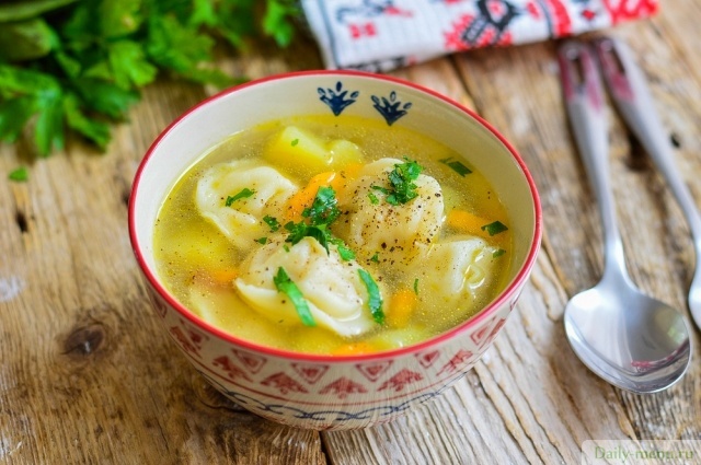вода, тесто пельменное, фарш из говядины, картофель, морковь, лук репчатый, масло топленое, соль поваренная пищевая, перец черный молотый, лавровый лист