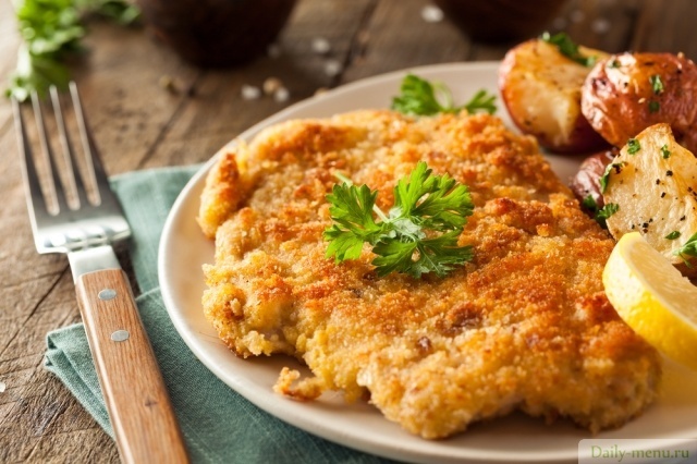 курица филе, без кожи, яйцо куриное, мука пшеничная , сухари панировочные, молоко 3,2% , масло оливковое, соль поваренная пищевая