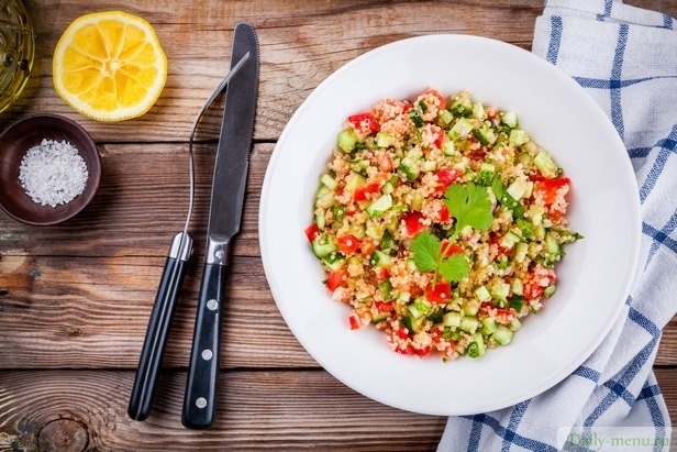 вода, помидоры, огурец грунтовый, киноа, масло оливковое, петрушка, сок лимонный, соль поваренная пищевая, перец черный молотый