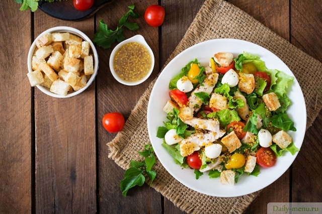 помидоры черри, сыр моцарелла, курица филе, без кожи, салат романо, масло оливковое, хлеб пшеничный, горчица дижонская, масло сливочное 72%, чеснок, сок лимонный, соль поваренная пищевая