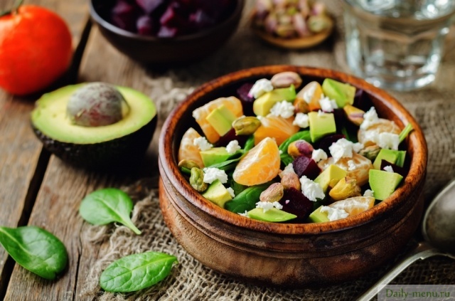 авокадо, мандарин, свекла, сыр козий, фисташки, шпинат, масло оливковое, сок лимонный