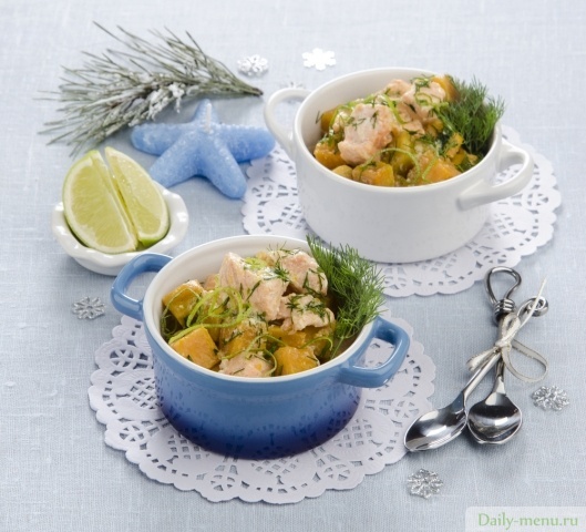 филе лосося без кожи, тыква, овощной бульон, сметана 18% жирности, сок лайма, укроп и другие пряные травы, масло оливковое, соль поваренная пищевая, перец черный молотый
