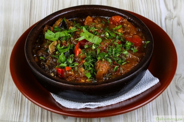 баклажаны, картофель, помидоры, перец красный сладкий, лук репчатый, масло оливковое, перец красный жгучий , чеснок, укроп и другие пряные травы, петрушка, кинза, соль поваренная пищевая, тимьян, базилик сушеный