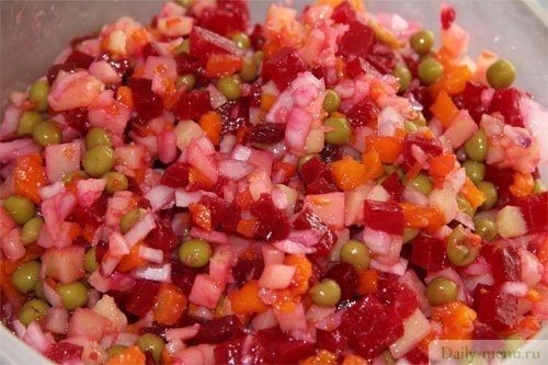 картофель, морковь, огурец соленый, горошек зеленый. консервы, свекла, масло подсолнечное