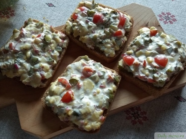 хлеб ржаной, сыр моцарелла, огурец маринованный, помидоры черри, сметана 18% жирности, лук репчатый, соль поваренная пищевая, перец душистый