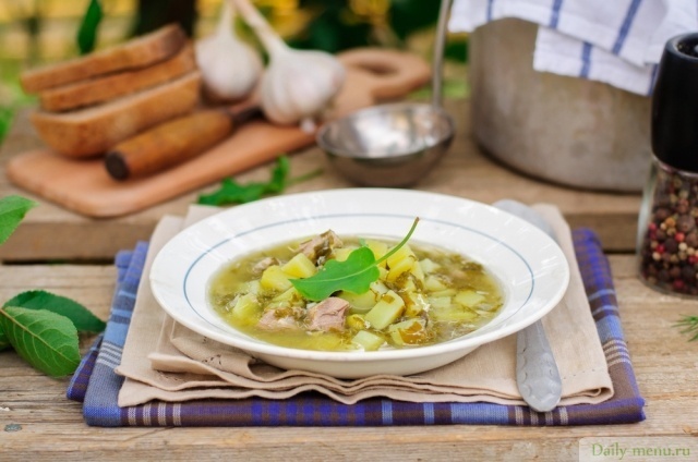 вода, говядина тушеная, картофель, лук репчатый, щавель, масло топленое, соль поваренная пищевая