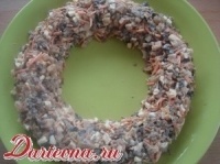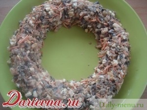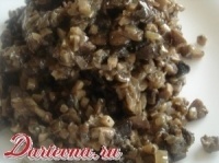 шампиньоны, куриная грудка, копченая, лук репчатый, сметана 10,0% жирности, яйцо куриное, морковь корейская, укроп и другие пряные травы, чернослив, масло оливковое