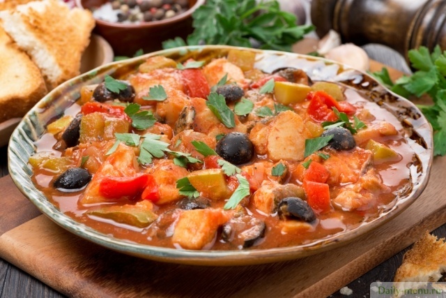 курица филе, без кожи, цуккини, помидоры, маслины средние и мелкие, перец болгарский красный, вода, лук репчатый, масло оливковое, петрушка, соль поваренная пищевая