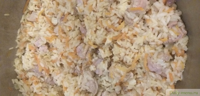 вода, рис длиннозёрный, индейка, грудка без кожи, морковь, лук репчатый, чеснок