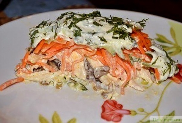 шампиньоны, курица филе, без кожи, огурец грунтовый, морковь корейская, майонез , масло оливковое, укроп и другие пряные травы