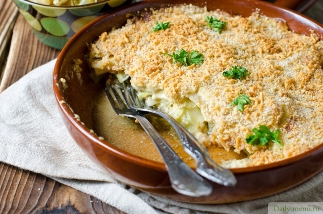 капуста белокочанная, картофель, молоко 2,5% , сыр российский, сметана 18% жирности, сухари панировочные, масло сливочное 72%, чеснок, соль поваренная пищевая, перец черный молотый