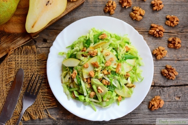 капуста пекинская, груша, орех грецкий, шпинат, масло оливковое, сок лимонный, соль поваренная пищевая