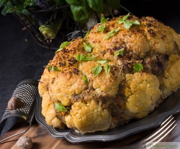капуста цветная, фарш из говядины, лук репчатый, сметана 18% жирности, яйцо куриное, петрушка, батон нарезной, соль поваренная пищевая, перец черный молотый