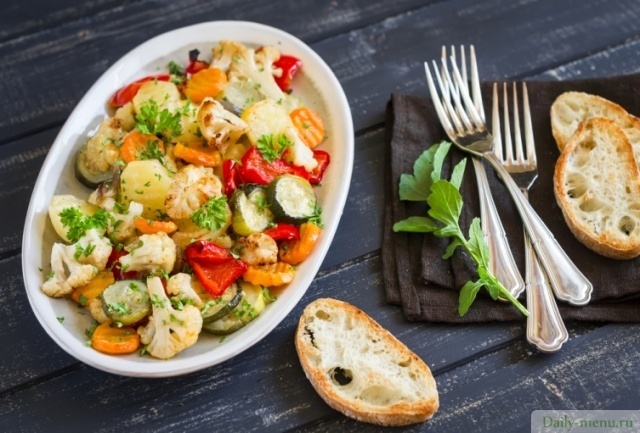 цуккини, перец болгарский красный, картофель, капуста цветная, морковь, лук репчатый, масло оливковое, петрушка, чеснок, соль поваренная пищевая, перец черный молотый