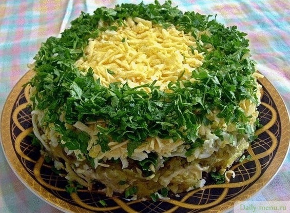 шампиньоны, картофель, огурец соленый, майонез , яйцо куриное, сыр голландский, лук репчатый, лук зеленый, петрушка, масло оливковое