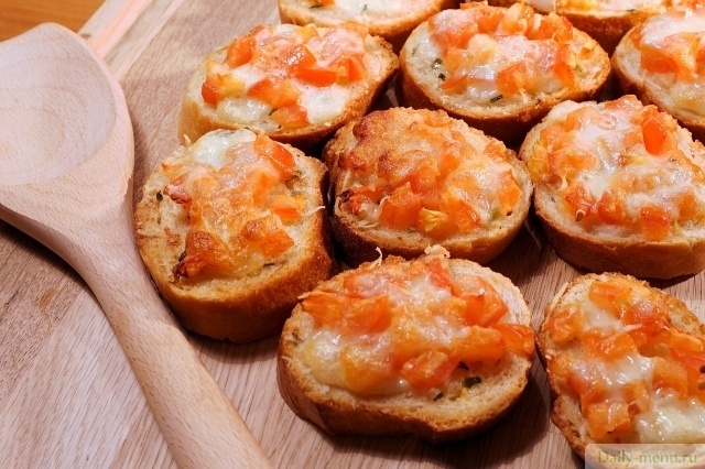 багет, сыр моцарелла, помидоры, чеснок, масло оливковое, травы итальянские, смесь