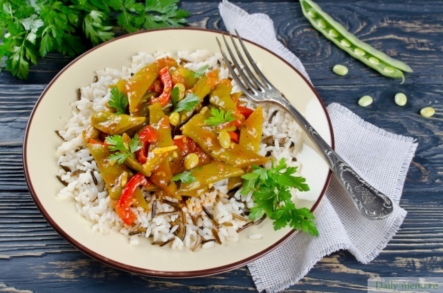 фасоль стручковая, томаты консервированные целые, перец болгарский красный, вода, лук репчатый, масло оливковое, томатная паста, петрушка, чеснок, сахар-песок, соль поваренная пищевая, карри