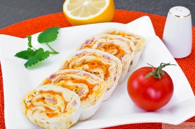 лаваш армянский, тонкий, ветчина особая, морковь корейская, сыр плавленый, сыр костромской, майонез