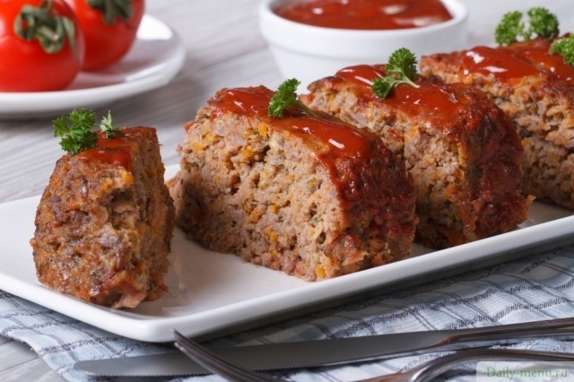 фарш из говядины, фарш из свинины, кетчуп, лук репчатый, хлеб пшеничный, морковь, яйцо куриное, горчица столовая, чеснок, масло оливковое, соль поваренная пищевая, перец черный молотый