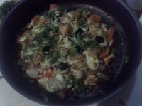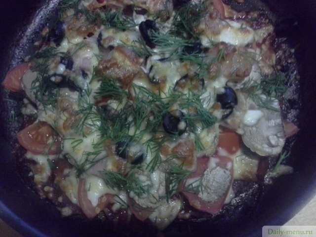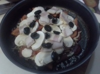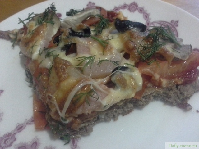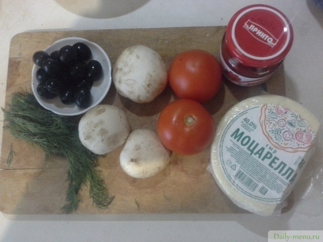фарш из говядины, помидоры, шампиньоны, сыр моцарелла, яйцо куриное, маслины крупные, бекон, томатная паста, укроп и другие пряные травы, масло топленое