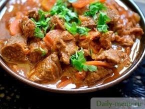 говядина вырезка, лук репчатый, морковь обычная, томатная паста помидорка, масло оливковое, чеснок, зира (кумин), паприка сушёная, молотая