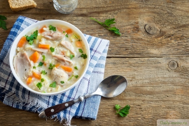 куриный бульон, курица филе, без кожи, капуста цветная, сливки, 10,0% жирности, рис круглозёрный , лук репчатый, морковь, масло топленое, чеснок, соль поваренная пищевая, перец черный молотый