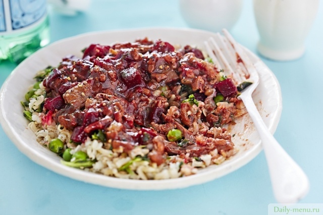 говядина грудинка мякоть, свекла, вино сухое, лук репчатый, сметана 18% жирности, масло оливковое, мука пшеничная , соль поваренная пищевая, горчица столовая, сахар-песок, розмарин, перец черный молотый