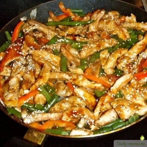курица филе, без кожи, фасоль стручковая, перец красный сладкий, лук репчатый, соевый соус, кунжут-семя