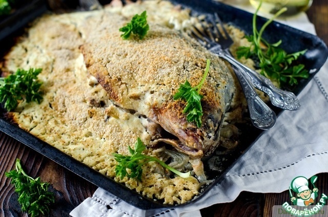 карп, сметана 15,0% жирности, рис белый, лук репчатый, сок лимонный, соль поваренная пищевая, масло подсолнечное, укроп и другие пряные травы